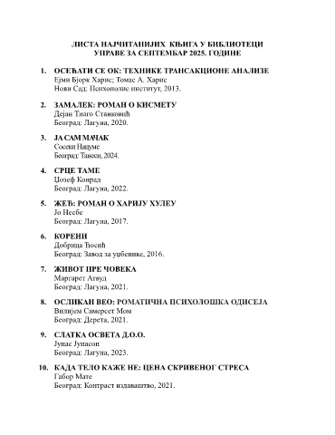 ЛИСТА НАЈЧИТАНИЈИХ КЊИГА У БИБЛИОТЕЦИ
